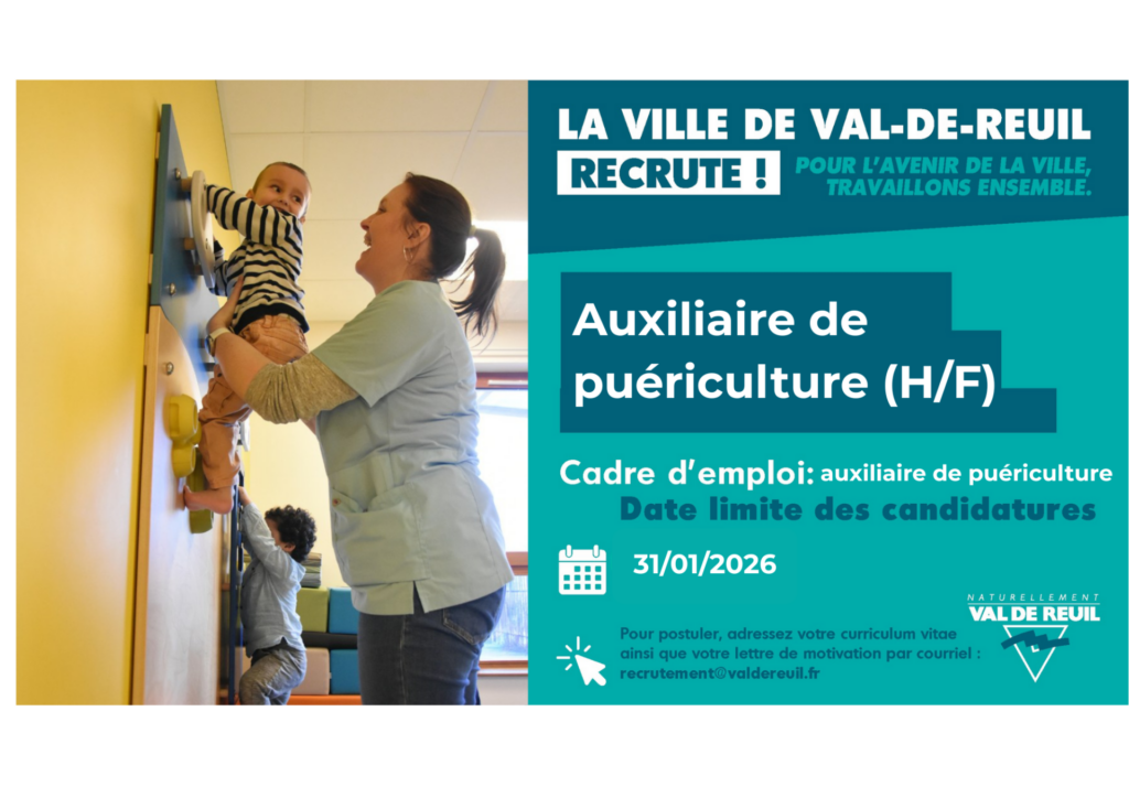 Pour rejoindre notre équipe petite enfance, professionnelle et bienveillante, merci d’adresser votre candidature : (lettre de motivation + C.V.) avant le 31 Janvier 2026 en rappelant la référence n° 2026-DRH- 1 par courrier à Mairie de Val-de-Reuil – 70, rue Grande – BP 604 – 27106 – VAL-DE-REUIL CEDEX ou courriel à recrutement@valdereuil.fr.