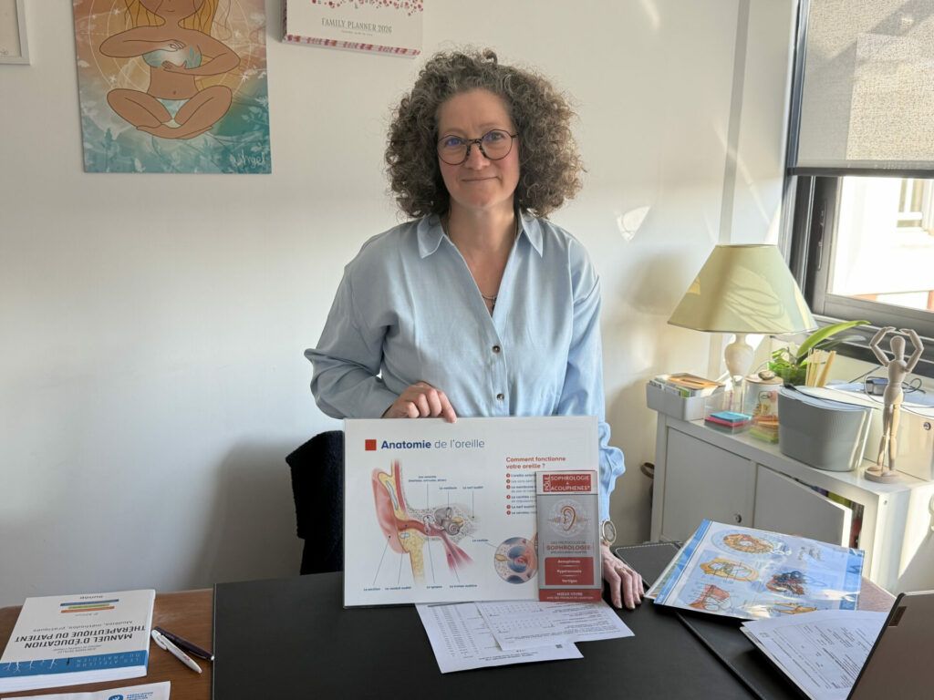 La sophrologie, rappelle-t-elle, est une pratique de soin non conventionnelle exercée en complément d’un suivi médical. Elle repose sur des exercices d’attention consciente, de respiration et de mobilisations douces centrées sur les ressentis corporels : « L’acouphène est un symptôme. Je prends la personne dans sa globalité. On travaille sur le moment présent, sur le positif, sur la perception du corps. Remettre le corps au centre permet d’avancer. » Une étude menée en 2021 par le Pôle Sophrologie et Acouphènes sur 140 patients montre une diminution moyenne de 51,9 % du score THI, l’indice mesurant le handicap lié aux acouphènes. À l’issue du protocole, plus aucun patient ne figurait dans les catégories « handicap lourd » ou « invalidant ».