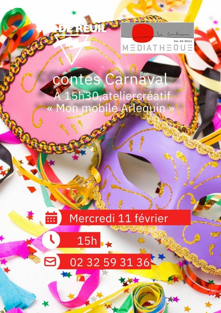 Contes Carnaval Mercredi 11 Février, à 15h, nous vous invitons à venir écouter des histoires de CARNAVAL. Puis à 15h30, créer votre mobile Arlequin.Gratuit.Sur inscription. Partagez : + Ajouter à mon Agenda Google + iCal / Outlook export Étiquettes : carnaval, contes, culture, médiathèque Date 11 Fév 2026 Heure 15:00 - 16:00 Localisation Médiathèque Le Corbusier 88 Rue Grande, 27100 Val-de-Reuil Catégories Animations Culture Organisateur Médiathèque Le Corbusier Téléphone 02 32 59 31 36 Email mediatheque.lecorbusier@valdereuil.fr Site Web https://mediatheque.valdereuil.fr Partagez cet événement