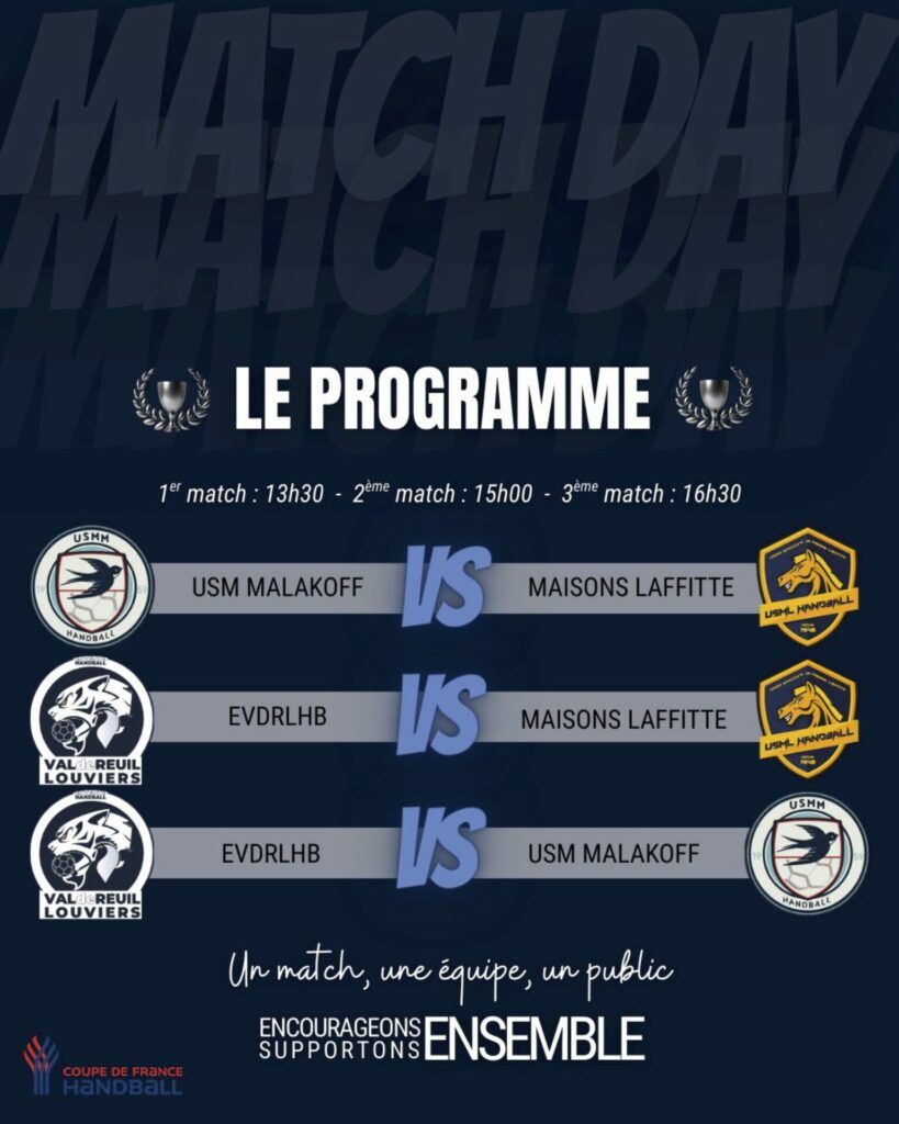 Ce dimanche 21 décembre 2025, se jouera le 3ème tour de Coupe de France de l’équipe fanion du club de l’Entente Val de Reuil – Louviers Handball qui recevra les équipes de Maisons-Laffitte et Malakoff.